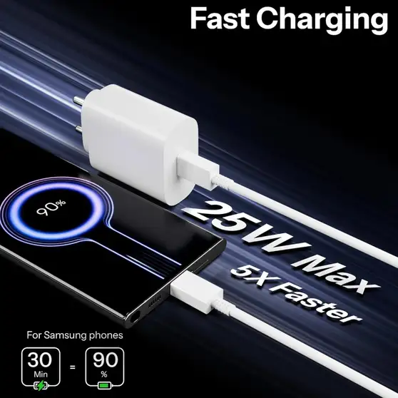 25W PD Super Fast Charger (EP-TA800) delivers reliable, high-speed charging for your Galaxy smartphones. With Power Delivery (PD) technology and a Type-C interface, it efficiently charges your device up to 50% in just 30 minutes.